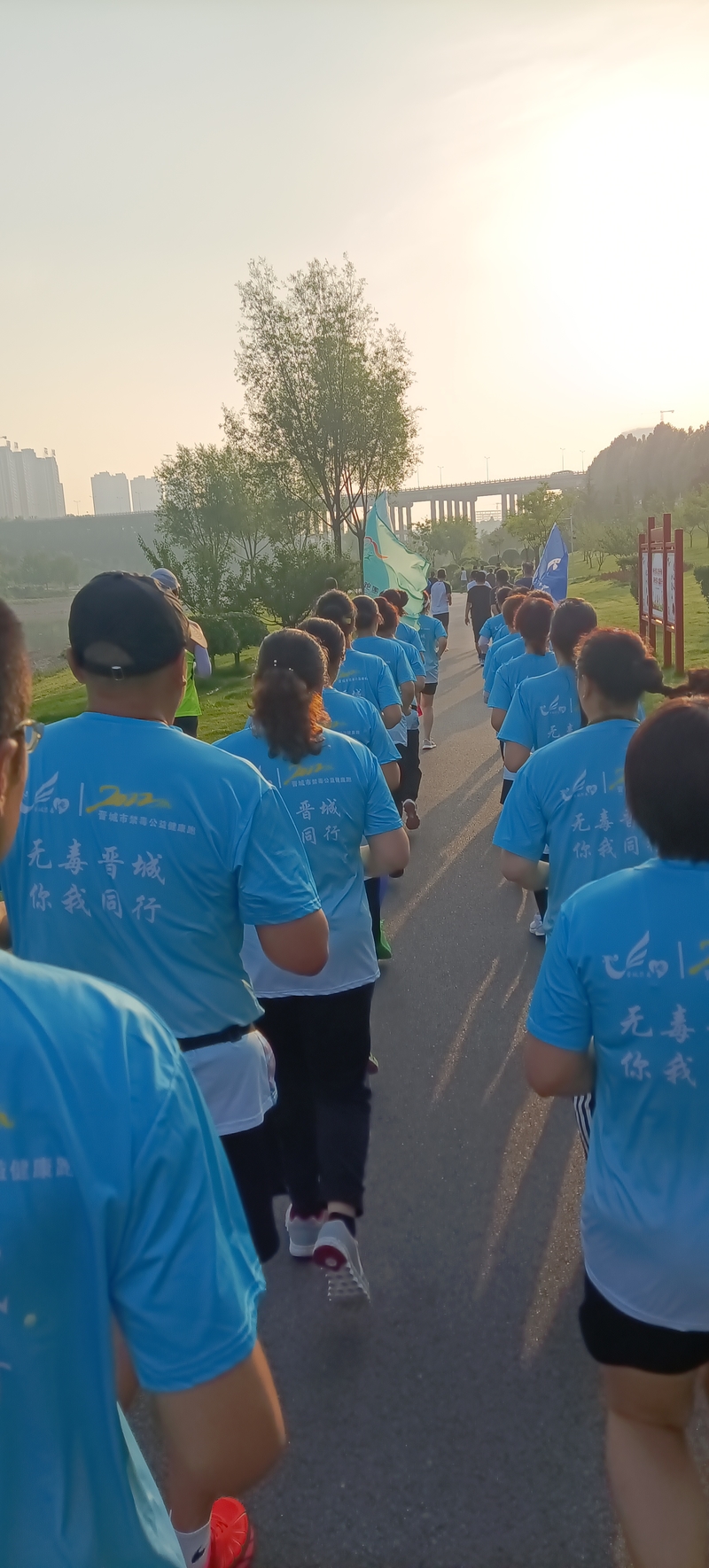 7月17日,凤西毽跑团二队,龙马湖公园禁毒公益健康跑打卡,“珍爱生命,远离毒品,无毒晋城,你我同行”