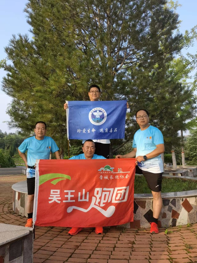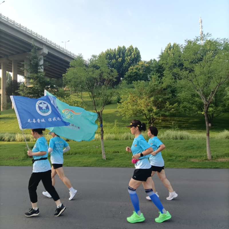7月12日,凤西毽跑团一队,赵树理公园禁毒公益健康跑打卡,“珍爱生命,远离毒品,无毒晋城,你我同行”