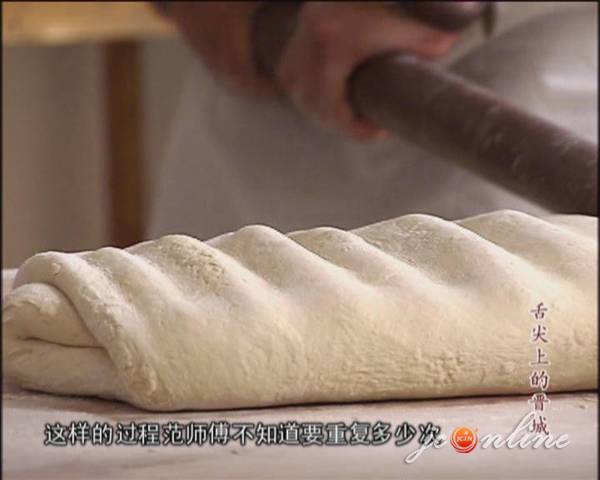 制作“馔面”第二步是压面。将打好的面放在案板上,用一根长2.5米的钢管,有节奏的弹压,这样弹压出来的面更劲道。